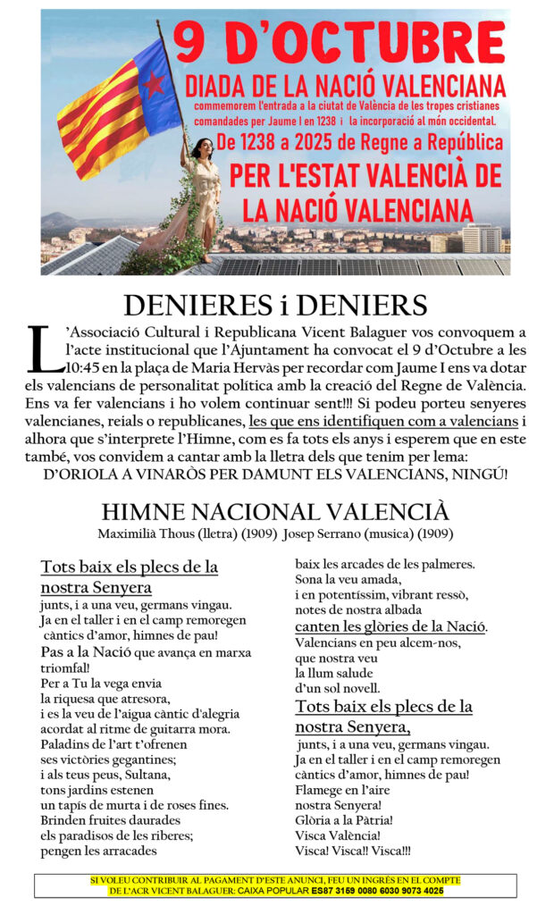 Anunci de l’ACR Vicent Balaguer, de plana sencera a CANFALI de la Marina Alta, convocant a l’acte institucional de l’Ajuntament de Dénia (PSOE-Compromís) per al 9 d’Octubre que en la seua convocatòria, l’Ajuntament amaga el sentit profund de la data.Per informar a les denieres i deniers del perquè recordem el 9 d’Octubre, l’ACR Vicent Balaguer de Dénia va contractar un anunci de plana sencera al CANFALI que va eixir ahir dissabte, amb un cost aproximadament de 600 euros; qui vullga col·laborar en el finançament d’este anunci per a informar els valencians d’allò que celebrem i recordem, podeu fer un ingrés, gran o xicotet, al compte de l’ACR en caixa Popular. PER CONTRIBUIR AL PAGAMENT D’ESTE ANUNCI JA PUBLICAT, FEU UN INGRÉS EN EL COMPTE DE L’ACR VICENT BALAGUER: