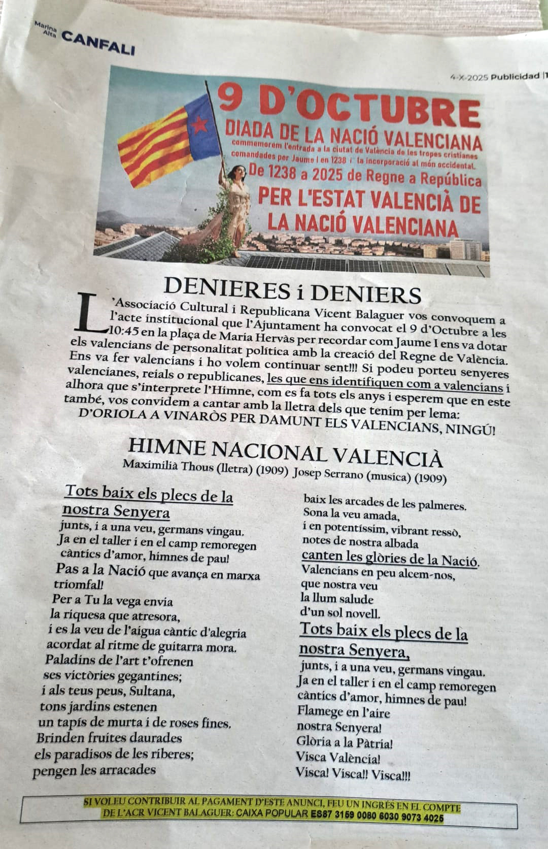 Anunci de l’ACR Vicent Balaguer, de plana sencera a CANFALI de la Marina Alta, convocant a l’acte institucional de l’Ajuntament de Dénia (PSOE-Compromís) per al 9 d’Octubre que en la seua convocatòria, l’Ajuntament amaga el sentit profund de la data.Per informar a les denieres i deniers del perquè recordem el 9 d’Octubre, l’ACR Vicent Balaguer de Dénia va contractar un anunci de plana sencera al CANFALI que va eixir ahir dissabte, amb un cost aproximadament de 600 euros; qui vullga col·laborar en el finançament d’este anunci per a informar els valencians d’allò que celebrem i recordem, podeu fer un ingrés, gran o xicotet, al compte de l’ACR en caixa Popular. PER CONTRIBUIR AL PAGAMENT D’ESTE ANUNCI JA PUBLICAT, FEU UN INGRÉS EN EL COMPTE DE L’ACR VICENT BALAGUER: